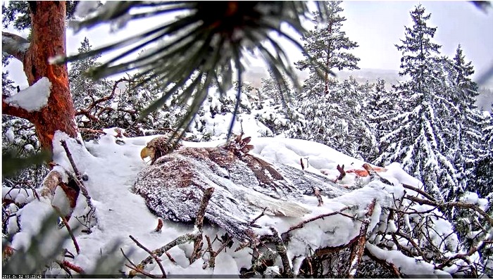 Kaamerapilt on varahommikust, veerand tundi enne kella kaheksat. Paar tundi hiljem oli lund nii palju lisandunud, et selle raskuse all rippuv oks varjas pesavaate ära. Mida muud, kui loota, et lind vastu peab, ja et ka ta partner peagi taas pesa külastab. Ja et ka teised juba kevadiselt meelestatud linnud, nii suured kui ka väikesed, selle rohke lume päeva üle elavad...